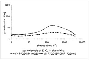 用60phr或以下的增塑劑含量生產的漿料,加入摻混樹脂(例如Vinnolit的C65V)可減低漿料的擴容性流變。與低粘度的乳化法糊樹脂(例如Vinnolit的E70 TT或E 68 CF)混合使用,也可達到這效果,更會增強制品的物理性能。